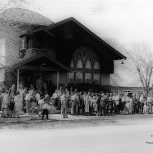 Congregation members pose in front of the Presbyterian Church in Ivanhoe, CA, in the 1950s. The church is located on the northwest side of Road 159, north of Wisteria Street.