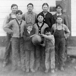 This was the first boys' basketball team for Rocky Ford School in Porterville, CA, in 1909-1910. Left to right, top row: Roscoe Tharp, Neville Carpenter, Edward W. Flory, Joseph Minovich; middle row, Frank Betts, Joe Ridgeway, Charles Flory; front row, Tony DeMillo and Tony Simonich. (Photo courtesy of Mary Haven)