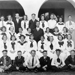 Graduating from the 8th grade at Jefferson School, Visalia, CA, on June 11, 1920, were, left to right: top row -- Ray Starkey, Marne Griffith, Bonham Prior, Dorothy Dunbar, Roy Wilhide, Frieda Loew, ?, Marguerite Cox, Van Salisbury; 2nd row -- Bertha Genereux, Sarah Toomey, Zelda Bridges, Gertrude Schawb, Mr. Clarence Horsman, Louise Conner, Eulalia Cooksey, Pauline Hougham, 3rd row -- Ereel Campbell, Helen Landram, Elizabeth Riese, Lillian Schaffer, Eugenia Archer, Etta May Thur, Miriam Emrick, Ruth Stewben; bottom row -- Norvel Dice, Cleo Adelsbach, Robert Head, Carlos Bowman, Thomas Block, Robert Richards. (Photo courtesy of Joyce A. McMillan)