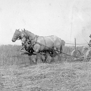Dillard E. Lewis, grandfather of the photo contributor, uses a horse-drawn implement to harvest his crop in the early 1900s. (Photo courtesy of Ruth Pugh)