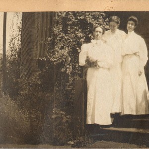 Black & white photograph of three women in long white dresses standing on steps. On back in black ink, "Christmas Love from - Miss Hailley." If you know any details from this image please contact the Rancho Cucamonga Public Library at (909) 477-2720 or reference@cityofrc.us