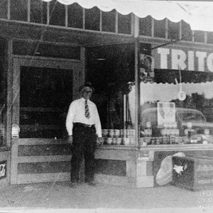 W. F. Pritchard stands in front of his store that was located on the northeast corner of Road 160 and Avenue 328 in Ivanhoe, CA. The store, shown here about 1920, also contained the U. S. Post Office branch. (Photo courtesy of Jerry Hobbs)