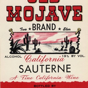 Red and black label for Old Mojave brand California Sauterne. Central images depicts an illustration of a desert landscape with variations of catcus. Wine is bottled by The Old Mojave Winery in Mira Loma, California. If you know any details from this image please contact the Rancho Cucamonga Public Library at (909) 477-2720 or reference@cityofrc.us