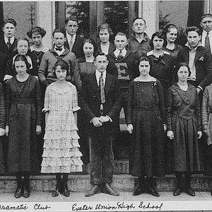 Members shown in this photo of the Exeter Union High School, Exeter, CA, Drama Club in 1921 included: Front row, left to right - Thelma Shanklin, Meryl Huston, Hazel Sellars, Marguerite Ligon, Raymond Porter, Miss Collins, Laura McWhorter, Miss Sittig, Hanna Matchin, and Loring Davis. Second row: Clyde Britten, Helen Sellars, Gerald Busch, Florence Montgomery, Francis Walker, Vera Glaze, Leon Cunningham, Josephine Brundage, Carl Link, Mary Virginia Dungan, Franklin Wilson, and Eva Cecile. Back row: Mr. Stewart, Ferris Sherman, Frances March, Herrick Waterman, Ota Nelson, Thomas Mixter, Arline Avery, Hillis Nelson, Charlotte Welch, Landis Davis, Helen Burnett, and Merrit Rowland. (Photo courtesy of Mrs. Don Montgomery)