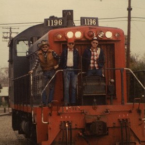 "Just east of ""E"" Street on Wye track in Exeter, CA, is a General Motors (EUD) 900 horsepower, 237,000 pound locomotive. Posed on the front are John Mowery, Charles Hinkmon, and Gerry Archer. (Photo courtesy of Frances Kirkman)"