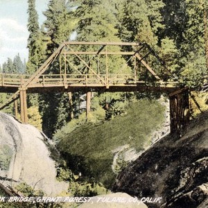 "This was the bridge over the Marble Fork of the Kaweah River in Sequoia National Park, Tulare County, CA, in the early part of the 1900s. The photo lettering incorrectly identifies the Marble Fork as being in ""Grant Forest,"" rather than near ""Giant Forest."" (Photo courtesy of Pam Wallace)"