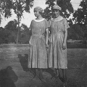 Zella and Louise, whose last names are unknown, pose in their cannery worker uniforms in Lindsay, CA, in 1919. (Photo courtesy of Alma Manlove).