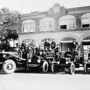 In 1934, the Dinuba, CA, fire department had four full-time, paid staff: S. B. Smith, Raleigh Green, Guy Ward, and Paul Nesgis. Additionally, there were 12 volunteer members of the department. Shown here with engines still on display at the department in 2002 are, left to right: Solon B. Smith, Captain, Secretary of the department, and driver; Raleigh B. Green, later Superintendent of Streets; Vern Stockholm, Chief; Leon Dial, Second Assistant Chief; Oliver Green, hoseman; Clarence (Blick) White, hoseman; Paul Nesgis, driver and pumper; Rawleigh Babcock, hoseman; Phil Baumbach, hoseman; Jack Hartung, engineer and mechanic (partner in Art Randolph Garage); Hilton (Heiney) Heimbach, First Assistant Chief and later Chief; Andy Bolinger, hose captain; Robert Collins, hoseman; George Stanton, assistant engineer; and Guy Ward, driver and first aid captain. One other volunteer, not available for the photo, was Al Bell, hoseman. Ward, Heimbach and Nesgis lost their lives in the line of duty as firemen. Dr. Palmer D. Miller was the official physician for the department, and regularly taught the men first aid. The engine on the left was a 1922 Stutz Bearcat, which was in service until the 1950s. (Photo courtesy of Dinuba Sentinel)