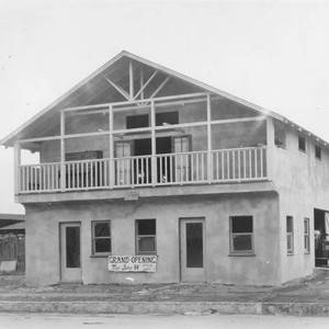 Black and white photograph of Alta Loma Fire Hall. There is a banner sign in front that reads: Grand Opening. The June 14th Dinner and Dance. If you know any details from this image please contact the Rancho Cucamonga Public Library at (909) 477-2720 or reference@cityofrc.us