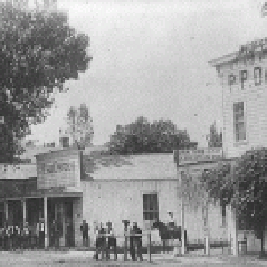 "This is a view of the west corner of Mill and Main streets, Porterville, CA, looking towards the south. ""The Office"" was a saloon. In 1890, the fire department was organized upstairs in the P. O. Davis building in the foreground. (Photo courtesy of Porterville Library)"