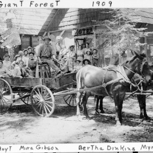 Loaded with visitors, this mule-drawn wagon is in front of the Giant Forest store in Sequoia National Park, Tulare County, CA. Among those in this 1909 photo are Grace Hoyt, Mira Gibson, Bertha Dinkins, and Myrtle Weaver. (Photo courtesy of Linda Hengst)