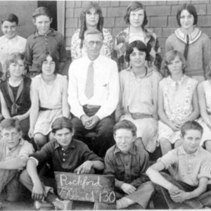 This class photo, taken in 1930, was of a class at Rocky Ford School in Porterville, CA. Left to right, back row: Dorothy (?), Johnnie Kotchevar, Clovis Byers, Marietta Anderson, Marie Wilson, and Milton Paradise. Middle row: Mildred Hayes, Frances Choate, Fern Hornsby, Lorraine Fenwick, teacher B. F. Bunker, Betty Yeager, Evelyn Cloer, Jamie Bateman, LaVerne Wilson. Front row: Wymand Mc(?), Louis Limas, David Williamson, and (?) Stadmiller. (Photo courtesy of Mary Haven)