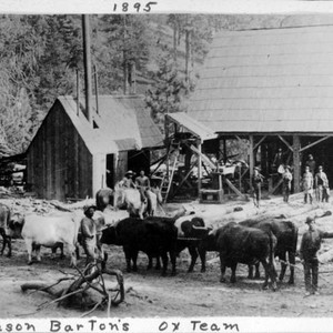 Jason Barton poses with his ox team in front of a lumber mill in Sequoia National Park in 1895. The oxen were used to drag logs to the mill. (Photo courtesy of Linda Hengst)