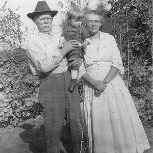 George Washington Pollock and his wife Margaret Jane Preston Pollock pose with granddaughter Ann Pollock at the family ranch in Visalia, CA, ca 1923. (Photo courtesy of Patricia Mathewson)