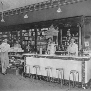 Claubes' soda fountain was a popular place when this photo was taken in 1907. It was located in the south part of the Pioneer Hotel. Mr. Candy, owner, is in the suit. The other man is Bob Evans, an employee at his father's Ford garage. (Photo courtesy of Porterville Library)