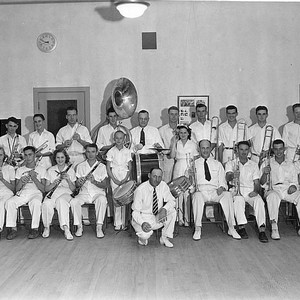 "The community of Woodlake, CA, had a city band in the 1940s, composed of both business people and students. The band, which practiced in the high school band room on Whitney Avenue, ""marched in Portuguese parades all over the county."" Members shown are, front row left to right, David Peden, Anna Alden, Dick Edmiston, Ruth Kress, Melvin Haury, George Webb, Lee Grimstead, Clement Haury, Tubby (Edgar) Lynds, Jene Eberle, and Elmer Yocubets. Second row, Bill Lewis, Dale Brown, Jack Webb, James Parkinson, Lloyd Lucas, Ewell Blair, Turk Lynds, Eugene Frey, Art Moran, Charles Blair, Fred Rabe, and Harold (Shorty) Beutler. Kneeling in front is director Oscar Payne. Majorette Ruth Davis Pugh stands to the right of the base drum. (Photo courtesy of Rugh Pugh)"