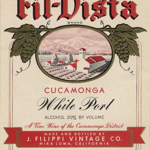 Red, white and green label for Fil-Vista Cucamonga White Port. Image depicts an illustration of a winery surrounded by grape leaves. Wine is made and bottled by J. Filippi Vintage Corp. in Mira Loma, California. If you know any details from this image please contact the Rancho Cucamonga Public Library at (909) 477-2720 or reference@cityofrc.us