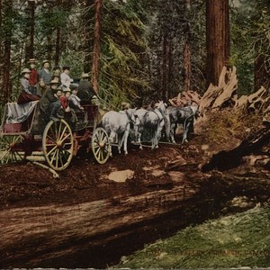 "Shown here are tourists loaded on a horse-drawn wagon ""driving"" along a fallen giant Sequoia tree trunk that has fallen. The location is in Sequoia National Park, CA. (Photo courtesy of Pat Ropes)"