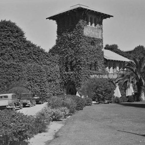 Photograph of the Virginia Dare Winery looking northeast. A few cars are shown on the driveway. If you know any details from this image please contact the Rancho Cucamonga Public Library at (909) 477-2720 or reference@cityofrc.us