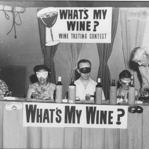 Photograph of people with blindfold taking a wine tasting contest. A sign reads: Whats my wine? Wine tasting contest. If you know any details from this image please contact the Rancho Cucamonga Public Library at (909) 477-2720 or reference@cityofrc.us