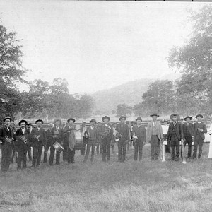 The community band of Lemon Cove, CA, in 1890 included John Carter, Porter Davis, Norel Britten, Dick Lane, Joe Carter, Frank Britten (leader), Jack McFadzean, Tom Pogue, Jim Carter, Earl Pogue, Grant Kirkman, and Ernest Britten. (Photo courtesy of Frances Kirkman)