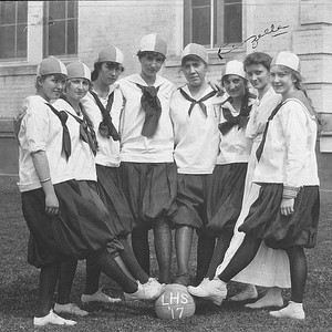 The girls' soccer team in 1916 at Lindsay High School, Lindsay, CA, was comprised of Lura Crouch, Ruth Tourtillott, Lars Topham, M. Ward, Zella Rocker, Beulah Green, Ruth Mason, and Louise Seeresh. (Photo courtesy of Alma Manlove)