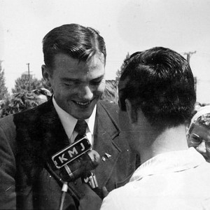 Bob Matthias, the 1948 Olympic gold medalist in the decathlon, is interviewed by KMJ Radio upon his return to his hometown, Tulare, CA. Mathias won the same event in 1952. (Photo courtesy of Sally Baker Dudley)
