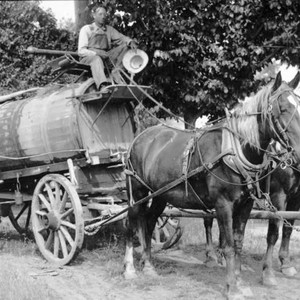 In the era of the early 1900s, this horse-drawn water tanker was used in Dinuba, CA, to control dust on city streets. (Photo courtesy of Dinuba Sentinel)