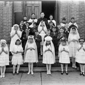 The first communion at St. Anne's Catholic Church in Porterville, CA, took place about 1920. Second from left in the front row is Olga Kotchevar. (Photo courtesy of Mary Haven)