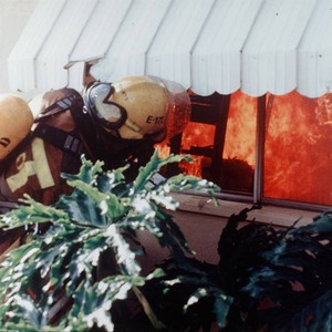 Color photograph of fireman looking into residence on fire through window. If you know any details from this image please contact the Rancho Cucamonga Public Library at (909) 477-2720 or reference@cityofrc.us