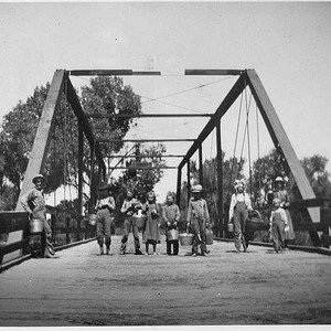 This 1900 view of the Rockford Bridge has some children standing in the middle with buckets. This was one of the few bridges across the Tule River west of Porterville, CA. (Photo courtesy of Porterville Library)