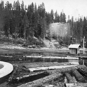Logs float in a holding pond at the lumber mill located at Hume Lake in Kings Canyon National Park, CA. (Photo courtesy of Sally Baker Dudley)