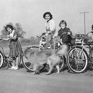 Kids on their bikes and with their dogs shown in this 1957 photo from l to r are: Tom Coe, Nava Child, Carol Nava, Jane Turner, ? Child, and Nancy Baird. (Photo courtesy of Nancy Baird)