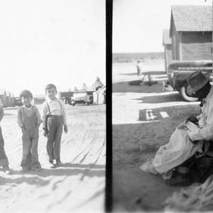 Teodoro Esquivel mends a cotton sack in Visalia, CA, in 1943. The photo of boys shows his son, Severo (husband of the contributor), second from right.