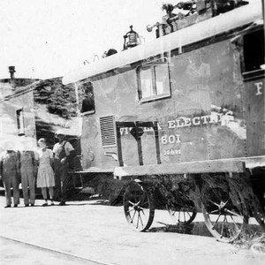 John Cord, Jim Hifner, Betsy Ross Pigg, and Donald McFadzean pose next to equipment of Visalia Electric Railroad Company. The location was Woodlake, Calif. (Photo courtesy of Frances Kirkman)