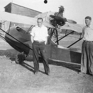 "Vernon ""June Bug"" Baird, age 24, prepares to start the engine of this airplane powered by a three cylinder, 45 horsepower Curtiss Wright engine in 1933. Baird built the airplane. At right is Clare Coe. (Photo courtesy of Nancy Baird)"