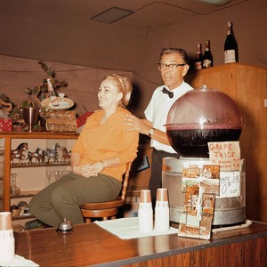 A man and a woman behind a counter displaying a grape juice dispenser. If you know any details from this image please contact the Rancho Cucamonga Public Library at (909) 477-2720 or reference@cityofrc.us