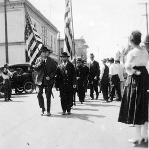 The occasion of this parade on Main Street in Visalia, CA, is uncertain, but it could have been the beginning of a 4th of July parade. Note the woman at right is holding what could have been a medal. (Photo courtesy of Cecelia Esquivel)