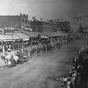 This 1895 parade was in downtown Porterville, CA, and shows the west side of Main Street at the intersection of Main and Mill Street. The local fire department is heading the parade. At that time, the fire department was also a social part of the town. (Photo courtesy of Porterville Library)