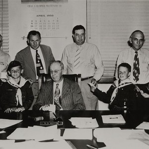 Posing with unidentified Cub Scouts in this 1950 photo are Tulare County, CA, Supervisors (left to right standing) William P. Bohland, Stan Simpson, Tom Link, and Duane Davis. Supervisor James Young is sitting. (Photo courtesy of William P. Bohland)