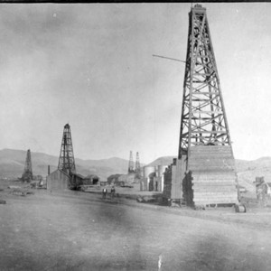 Oil derricks stand in the oil fields of Coalinga, Ca, ca 1910 Coalinga is in the extreme southwestern part of Fresno County. (Photo courtesy of Steve Worthley)