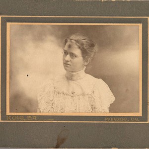 Black & white photograph of a woman with glasses on black card stock with Kohler Pasadena, CAL embossed at the bottom. On back written in pencil, ""Annie Maxson Senior Prep. '97."" If you know any details from this image please contact the Rancho Cucamonga Public Library at (909) 477-2720 or reference@cityofrc.us