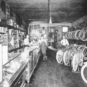 This is the interior of Woodhouse Cyclery in Dinuba, CA, in 1916. From left to right are J.W. Woodhouse, John Reynolds, and Carl Hokins. (Photo courtesy of Dinuba Sentinel)