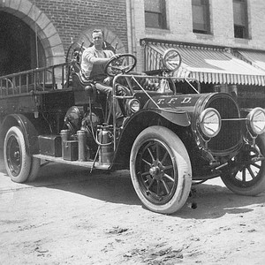 About 1920, the Tulare, CA, city fire department purchased this Pope-Hartford truck, shown here with an unidentified driver. This was Tulare's first motorized fire truck. The firehouse was located on the west side of the 100 block of South K Street. (Photo courtesy of Gladys Barnes)