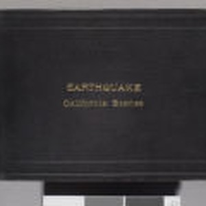 Bound in textured black material. The title, "Earthquake / California Scenes," is embossed in the center of the cover in gold lettering. Photos on pages 1-53 are of the damage wrought by the 1906 San Francisco earthquake, taken by Jack London. Photos on following pages are of Sonoma County and surrounding areas including Yosemite and the San Francisco bay. Album has very slight wear around edges. Starting with page 89 -- contact print #05499, it would appear that the counter on the camera stopped working, and someone chose to number the contact prints by hand in ink above each print, starting with #05501, and skipping to #05501. This hand-numbering continues through the end of album 41 and into 42.