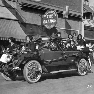 J. R. Martin's Orange billiards parlor served as the backdrop for this entry in a 1922 Armistice Day parade in Porterville, CA. (Photo courtesy of Porterville Library)