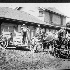 "William and W.B. Akers prepare to haul a load on their drayage wagon from the Southern Pacific Railroad Depot in Dinuba, CA, about 1916. The low bed on the wagon was designed to slide heavy objects from the station platform with a minimum of lifting. This building was moved to South ""K"" St. in Dinuba and became the home of the Alta District Historical Society. (Photo courtesy of Alta District Historical Society)"