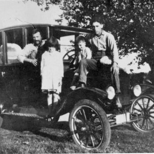 Joe Flea of Dinuba, CA, shows off his new car with his children Etta and Pete. George Vissio is in the car. The photo was taken on Joe's farm. (Photo courtesy of Rosemary Wymenga, grandniece of Joe Flea)