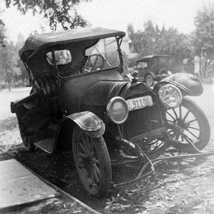 "The back of the original photo shown here contains the note, ""Windshield I went through July 8, 1922 (Saturday)."" This auto, damaged and parked along a street in Visalia, Calif., is licensed as ""CAL22 91108."" (Photo courtesy of Cecelia Esquivel)"