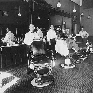 This barber shop in downtown Visalia, CA, was operated by Dichran Iskenderian, shown standing by the last chair in the back. (Photo courtesy of Lucinne Bennett)